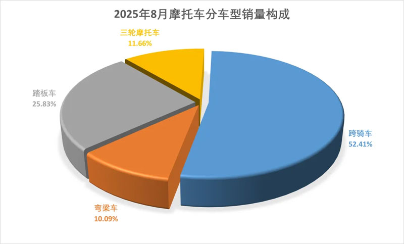 1-8月,跨騎車產銷755.60萬輛和752.00萬輛,同比增長17.49%和17.82%;踏板車產銷371.77萬和370.68萬輛,同比下降5.61%和7.39%;彎梁車產銷143.08萬輛和144.82萬輛,同比增長27.48%和31.71%。從各車型銷量占二輪車總銷量的比重看,跨騎、踏板和彎梁三類車型占比分別為52.41%、25.83%和10.09%。