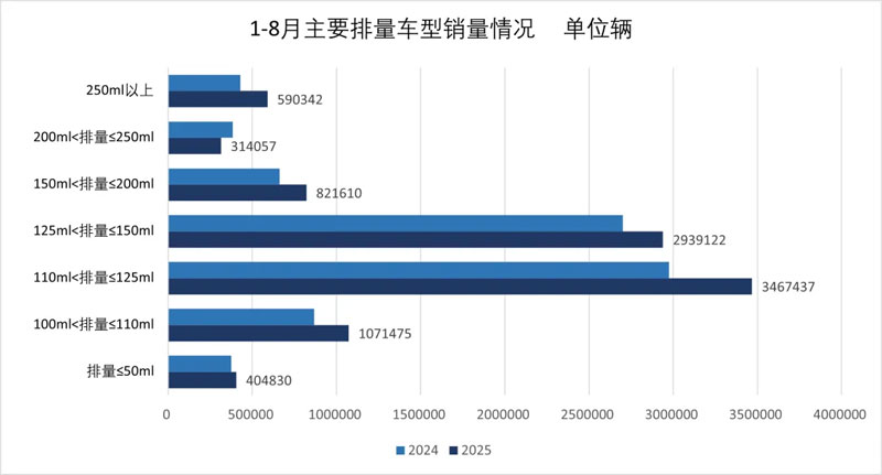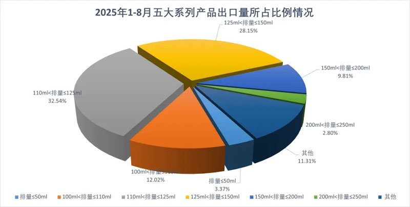 8月,出口量位居前六位的系列品種為:125系列(110ml<排量≤125ml)、150系列(125ml<排量≤150ml)、110系列(100ml<排量≤110ml)、200系列(150ml<排量≤200ml)、250系列(200ml<排量≤250ml)和400系列(250ml<排量≤400ml),分別出口37.94萬輛、29.84萬輛、15.47萬輛、12.26萬輛、3.60萬輛、2. 96萬輛。與去年同期相比,125系列增長31.70%,150系列增長10.58%,110系列增長30.86%,200系列同比增長38.93%,250系列增長9.39%,400系列增長60.46%。