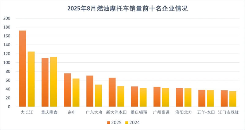 1-8月,燃油摩托車銷量前十名企業(集團)為大長江、隆鑫、宗申、廣東大冶、新大洲本田、重慶銀翔、廣州豪進、洛陽北方、五羊-本田和江門珠峰,分別銷售172.24萬輛、110.32萬輛、75.68萬輛、70.47萬輛、65.77萬輛、45.97萬輛、45.26萬輛、42.39萬輛、38.37萬輛和37.48萬輛。