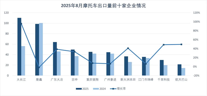 1-8月,摩托車出口量排名前十位的企業依次為:大長江、隆鑫、廣東大冶、宗申、重慶銀翔、廣州豪進、新大洲本田、江門珠峰、重慶千里科技、航天巴山,上述十家企業共出口536.32萬輛,占摩托車出口總量的61.36%。