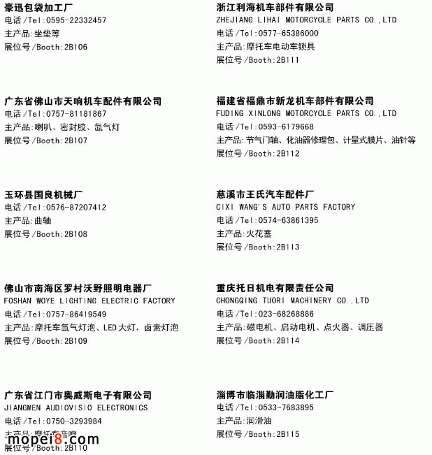 第三十三屆(2013春)全國摩托車及配件展示交易會已于2013年4月25日在濟南國際會展中心召開,2013春季全國摩配會已過去一個月了,仍有一些摩配同仁問到關于此次的展會情況及參展企業的信息,為方便需要了解此次展會信息的同仁,現將參展企業的主營產品及聯系電話發布出來。
